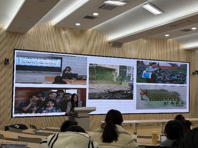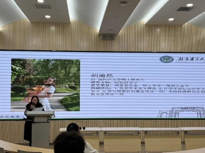 随后23级阿拉伯语语言文学硕士研究生胡逾然同学以自身心路历程为主线,提出成功的科研离不开与导师积极沟通、积极参与学术论坛,以及不断写作积累经验。同时她也用电视剧《玫瑰的故事》中的情节鼓励同学们专注于过程,保持踏实肯干的心态。最后她分享了“物来顺应,未来不迎,当时不杂,既过不恋”的格言与在场同学共勉。