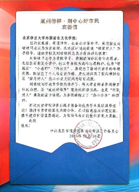 近日,外国语言文化学院收到一封来自通州区的特别表扬信,信中对2025级德语(涉外林业工程人才实验班)刘峻岐同学予以通报表扬,并授予其“通州榜样·副中心好市民”荣誉称号。这份荣誉,将他在紫荆雅园社区暑期夏令营中温暖人心的志愿服务故事,再次带回到我们眼前。
