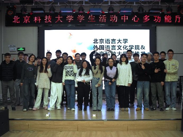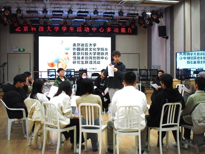 为加强校际交流与合作,促进研究生之间的沟通互动,2025年12月20日下午,外国语言文化学院携手北京科技大学钢铁共性技术协同创新中心,顺利举办“语通心意,科创同行”校际交流活动。本次活动在北京科技大学学生活动中心进行,二十余位同学欢聚一堂,现场气氛融洽、交流热烈。