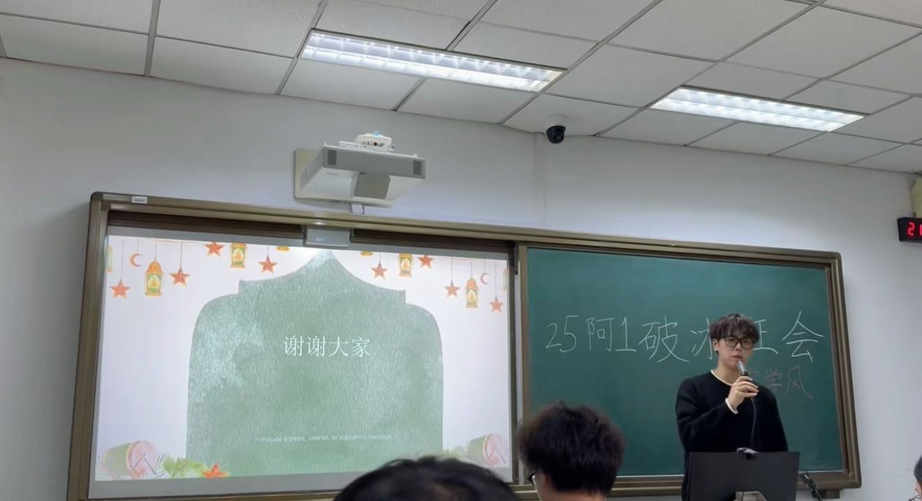 随后,在阿拉伯语学习分享环节,学习委员彭慧珍率先分享了自己在词汇记忆、语法梳理与口语练习中的独特方法,并鼓励大家打破“单项接受”的学习模式,倡导“我们分享、我们借鉴、我们共进”的互动理念,在她的带动下,班级里多位阿语学习表现优异的同学也踊跃发言,结合自身实践,就“如何高效利用碎片时间”、“怎样营造沉浸式语言环境”等具体问题展开了深入交流。现场讨论气氛热烈,使经验分享会真正实现了从“个体优秀”到“集体卓越”的赋能转化。