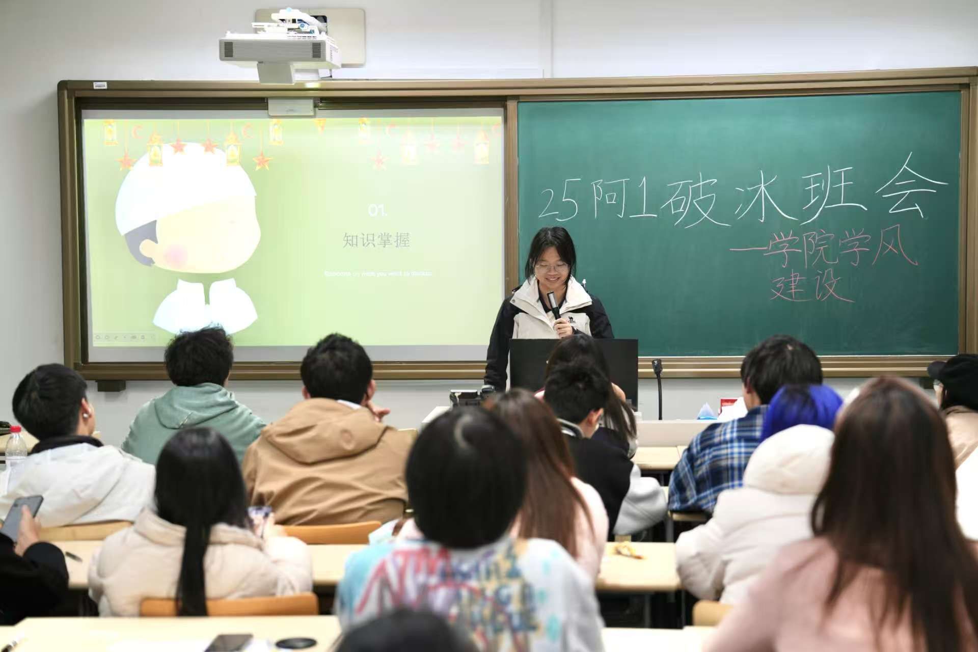 10月22日晚,外国语言文化学院2025级阿拉伯语1班举办了以“语聚新声·共创学风”为主题的学风建设专题班团活动。活动在班委的精心组织和班主任庞博老师的全程参与下,由班长陈梓涵、学习委员彭慧珍、组织委员陈佳怡、文艺委员庄茗竹与宣传委员吴逸灵共同策划主持。活动立足于当前班级特征与专业学习要求,旨在促进同学交流、增强文化认同、激发学习动力,共同营造积极互动、互助共进的班级学习氛围。